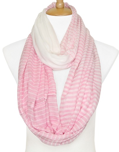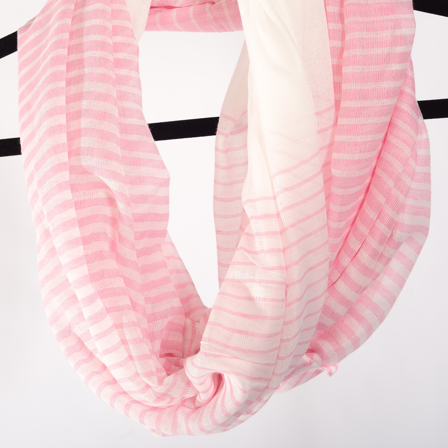 Irregular stripes of pink and white make this baby-soft infinity the perfect accent to any fresh outfit.